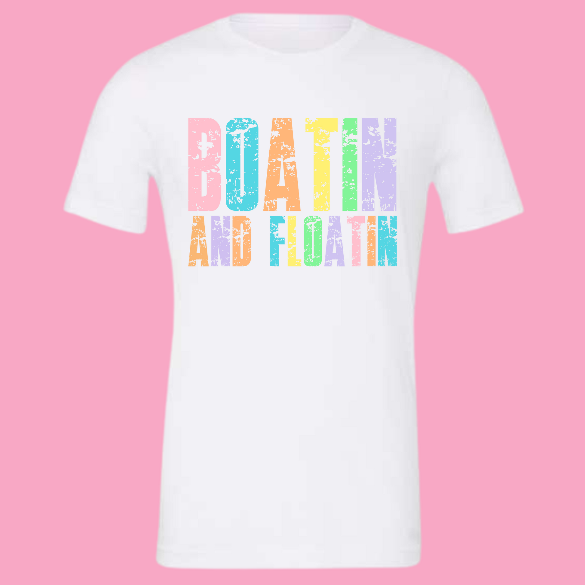 Design: Multicolor distressed text – “BOATIN AND FLOATIN”