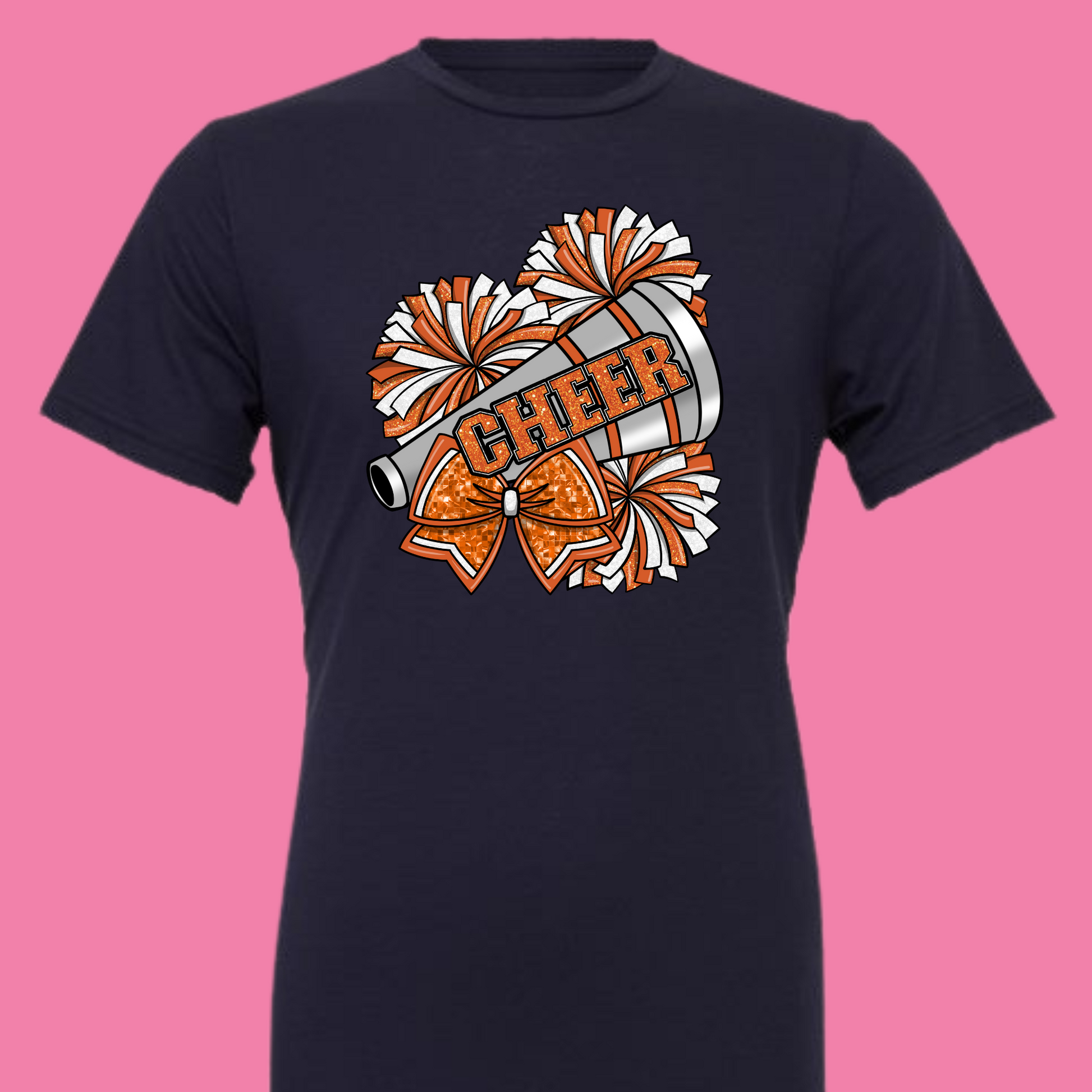 Cute orange Cheer Tee with pompoms and megaphone with sparkly bow